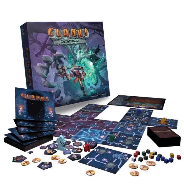 Clank! Catacumbas es una aventura de construcción de mazo y exploración de mazmorras que se genera de forma modular con losetas. Armá tu mazo, adentrate en las catacumbas, agarrá artefactos valiosos 💎 y escapá antes de que el dragón te haga ruido… y te cocine. Empuja tu suerte, planificá rutas y gestioná el Clank! 🔔 para volver vivo a la superficie.