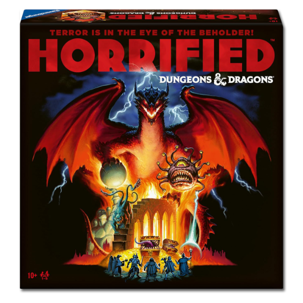 Horrified: Dungeons & Dragons es un juego cooperativo donde el grupo enfrenta a monstruos icónicos de D&D (Beholder, Displacer Beast, Mimic y Dragón Rojo). Introduce el uso de d20 para habilidades y ataques, y cada monstruo propone retos únicos tipo rompecabezas en el mapa de Waterdeep y Undermountain.